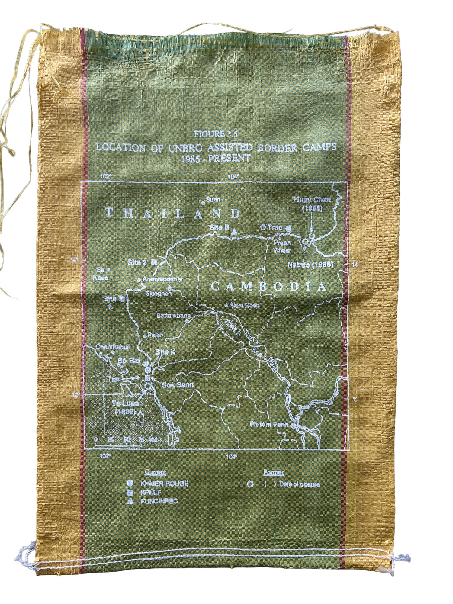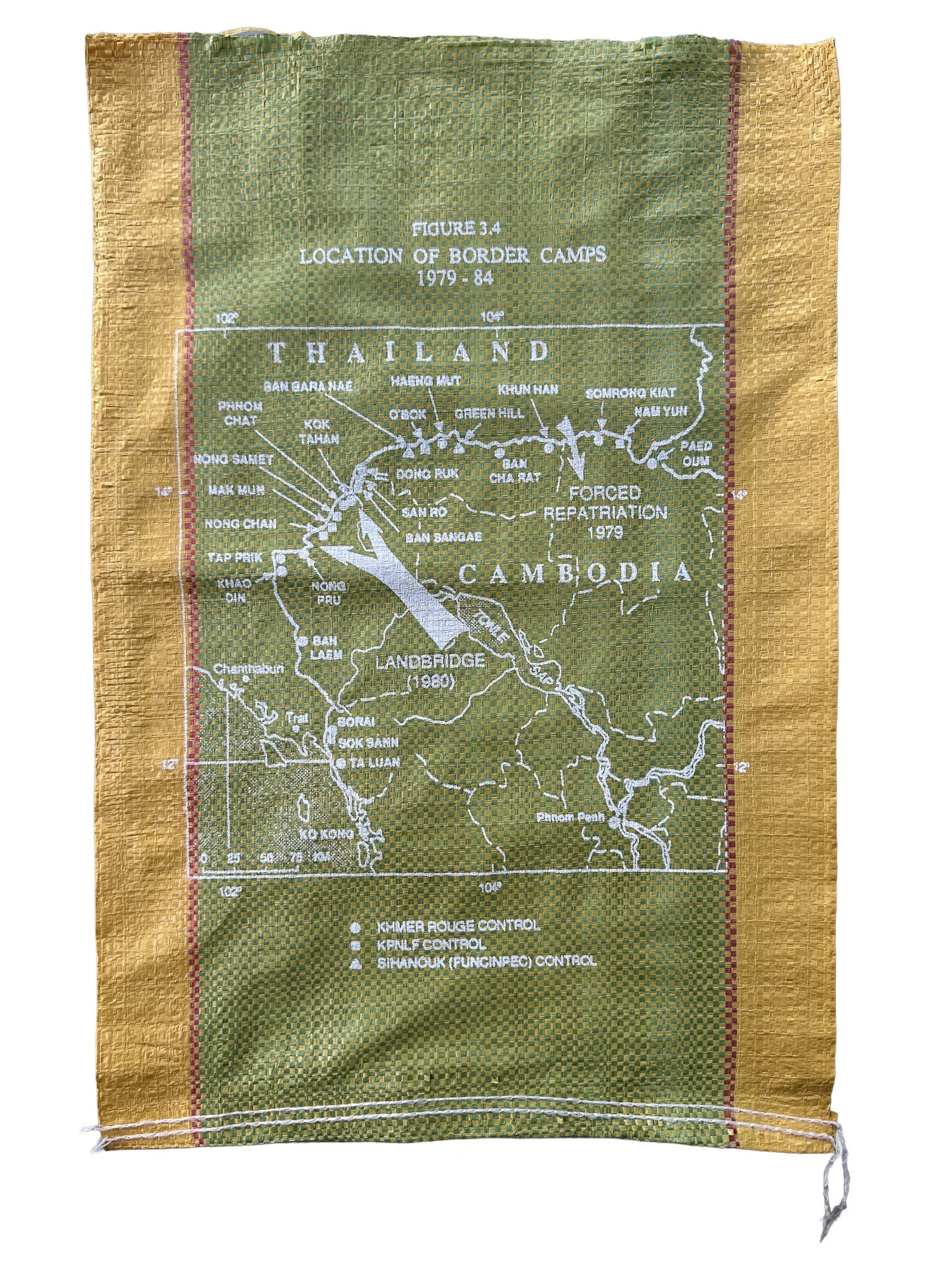 Border Camps Map (1979–84), 2025, silkscreen print on rice sack, 52×37cm