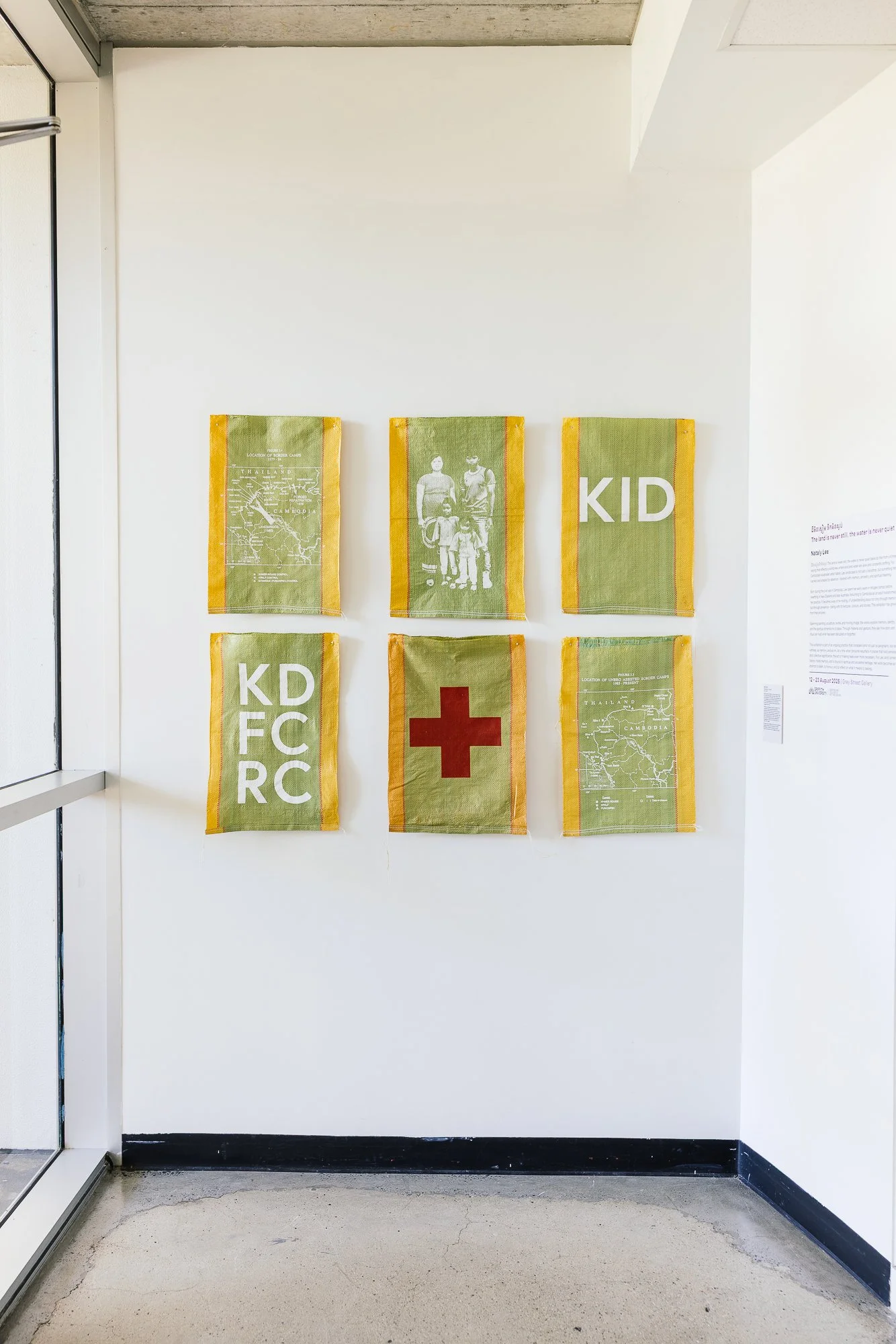 The series draws on archival research and personal memory. Printed onto rice sacks, materials associated with aid and survival, the works trace fragments of displacement, movement, and return. Maps, text, and images are layered onto these surfaces, transforming everyday materials into carriers of personal and collective history.