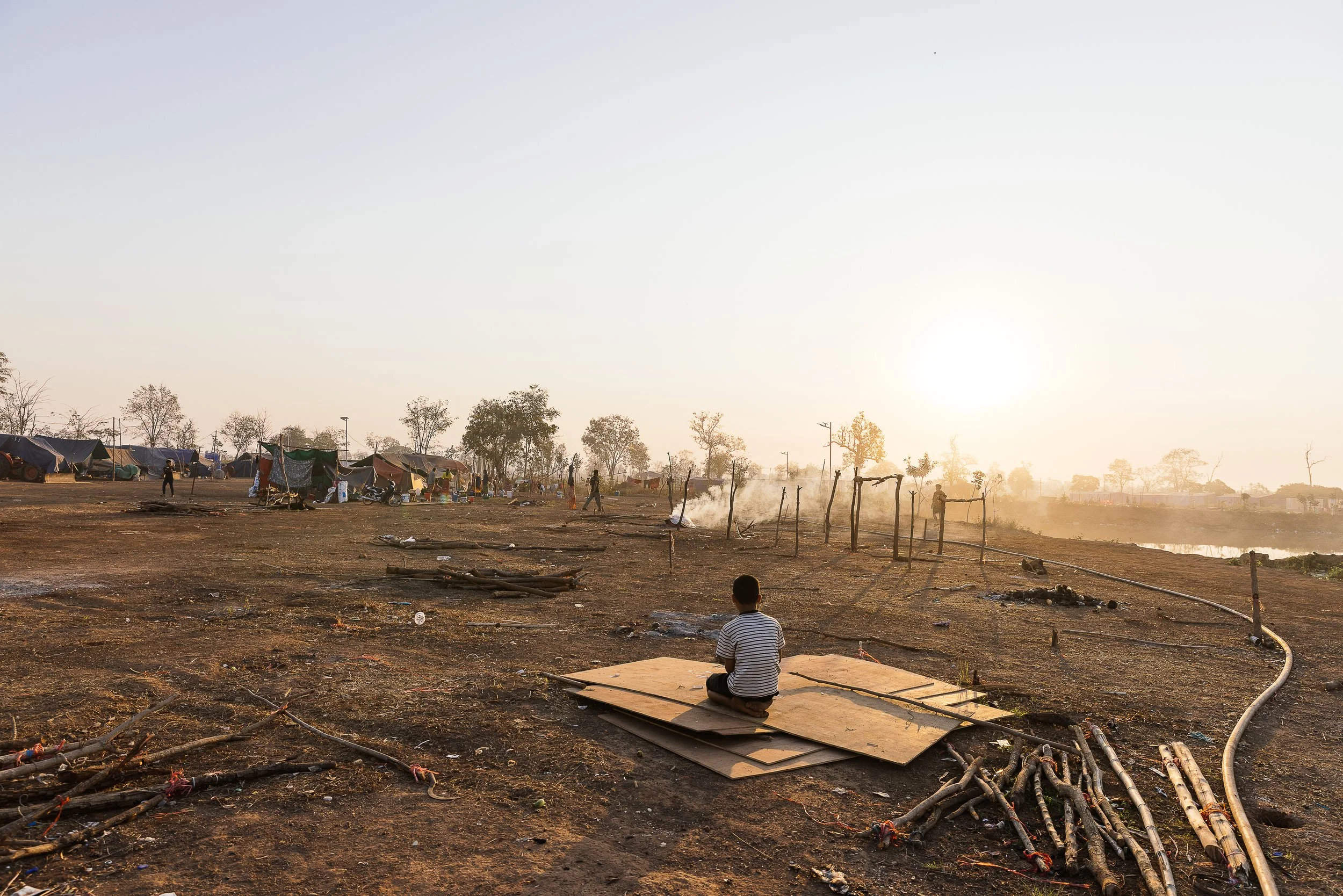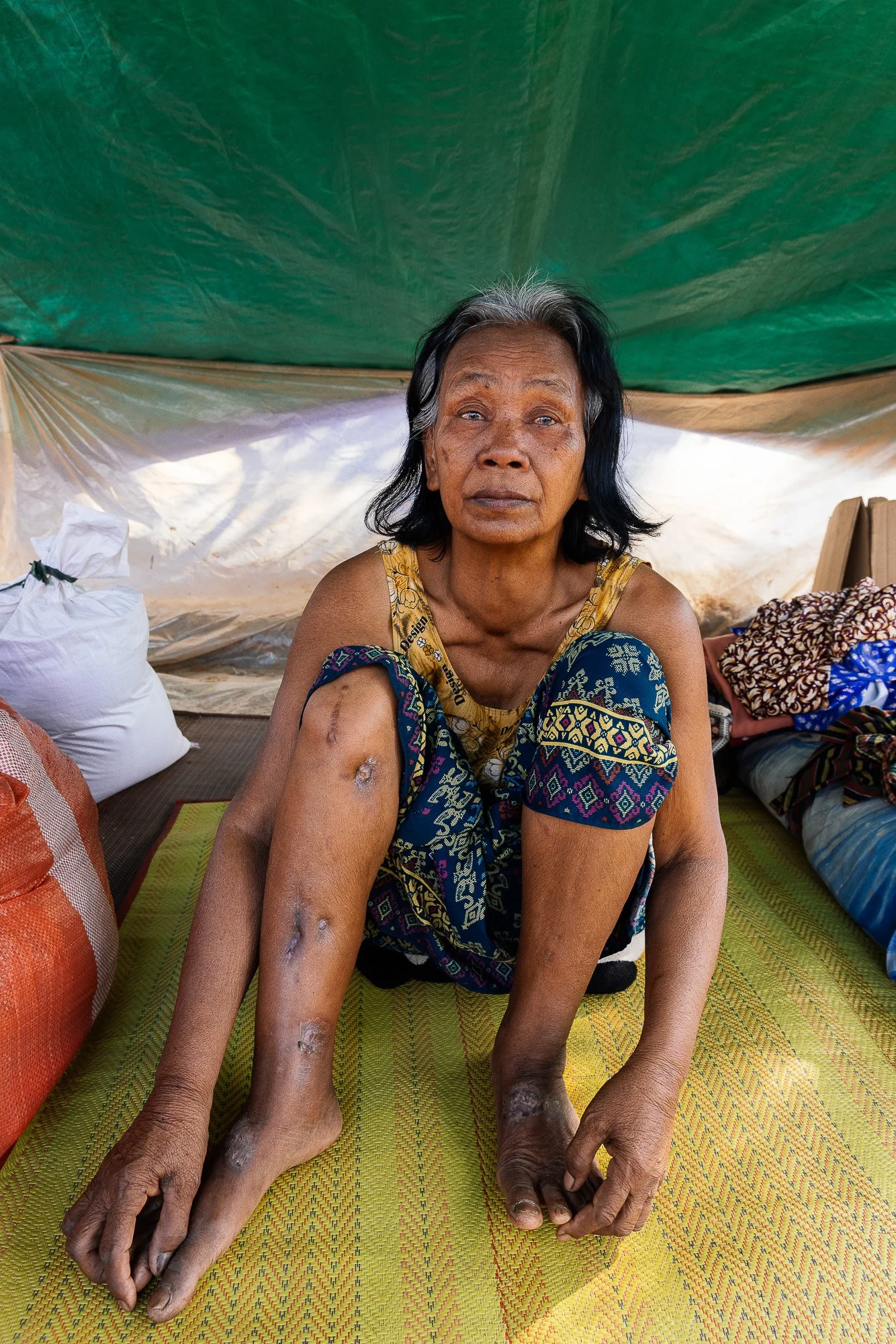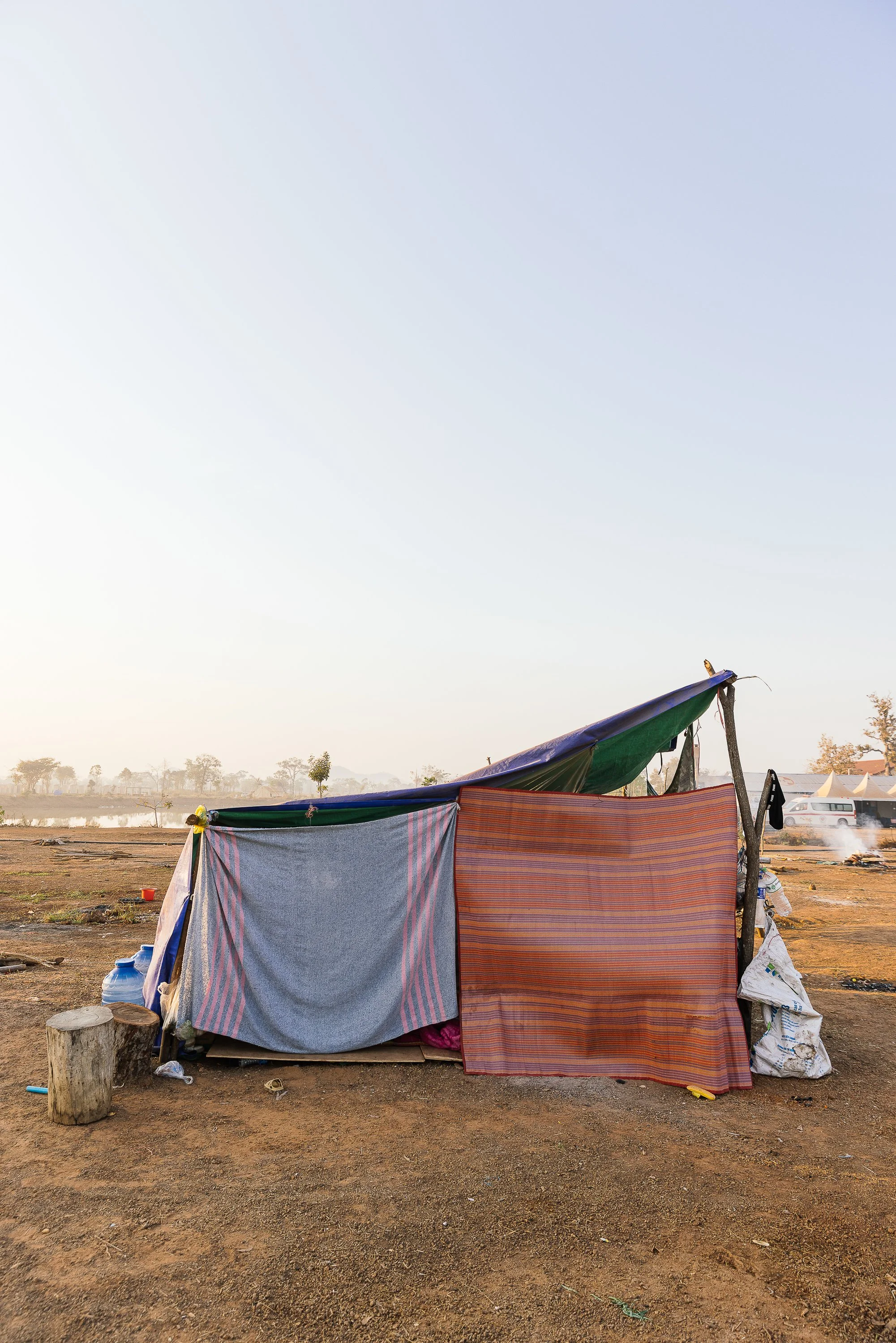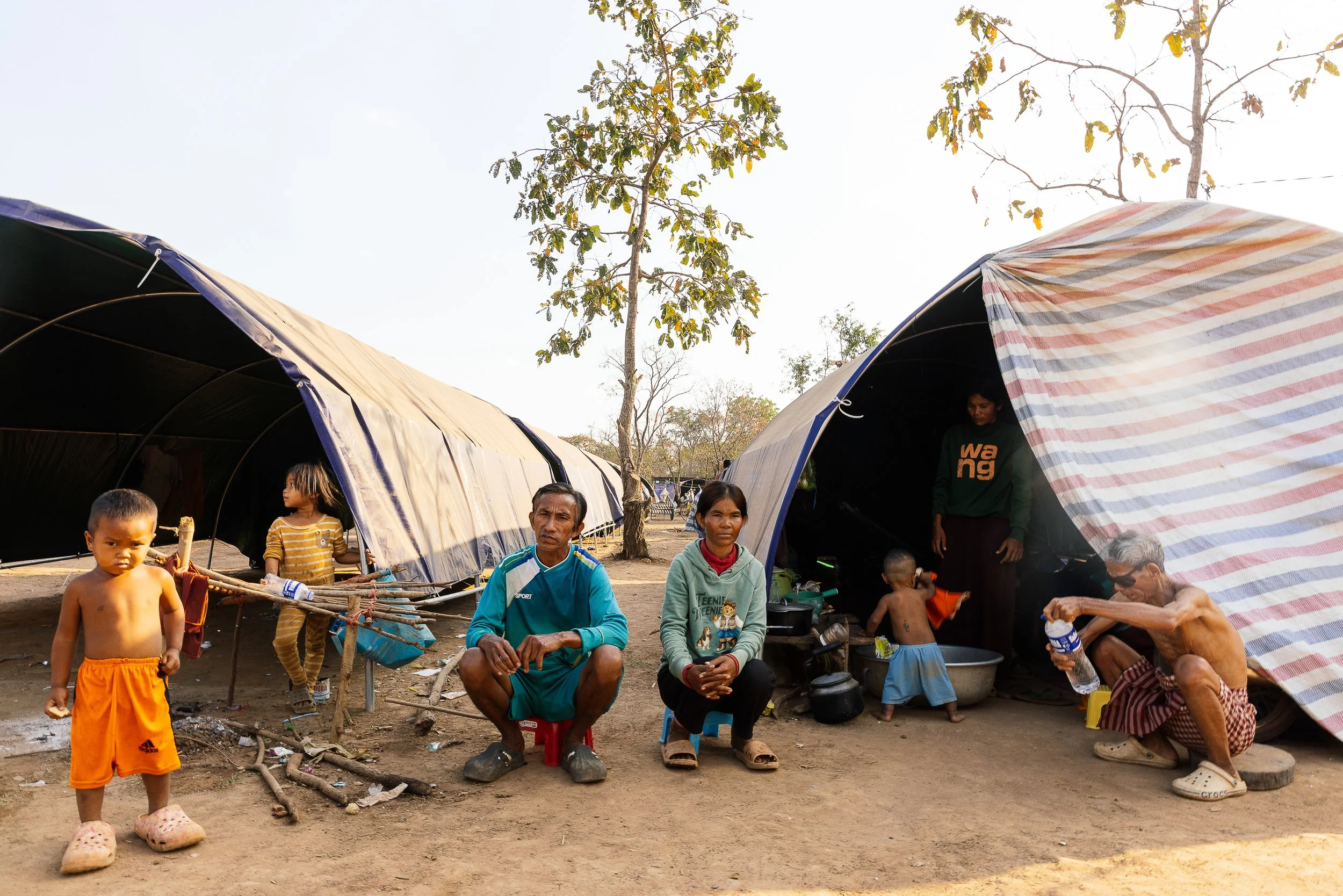The work develops through ongoing photographic research in displacement camps along the Thai–Cambodian border, where families have taken refuge after fleeing violence and instability in nearby regions. Within these settlements, shelters constructed from tarpaulins, salvaged wood, and reused textiles become spaces where everyday life continues. Cooking, resting, washing, and caring for children unfold within structures never intended to be permanent.