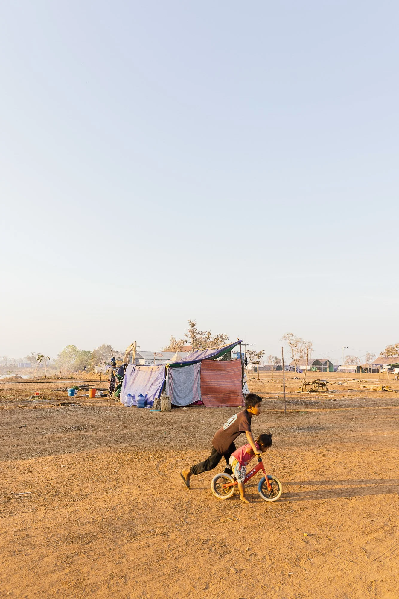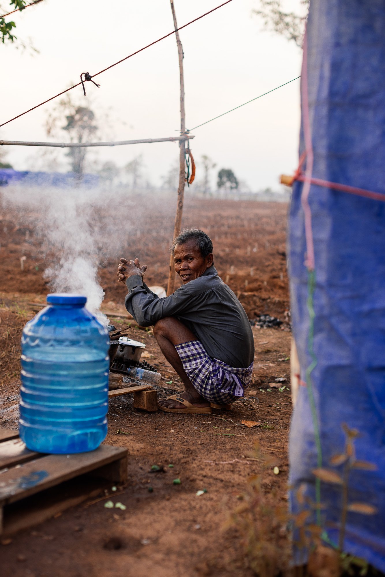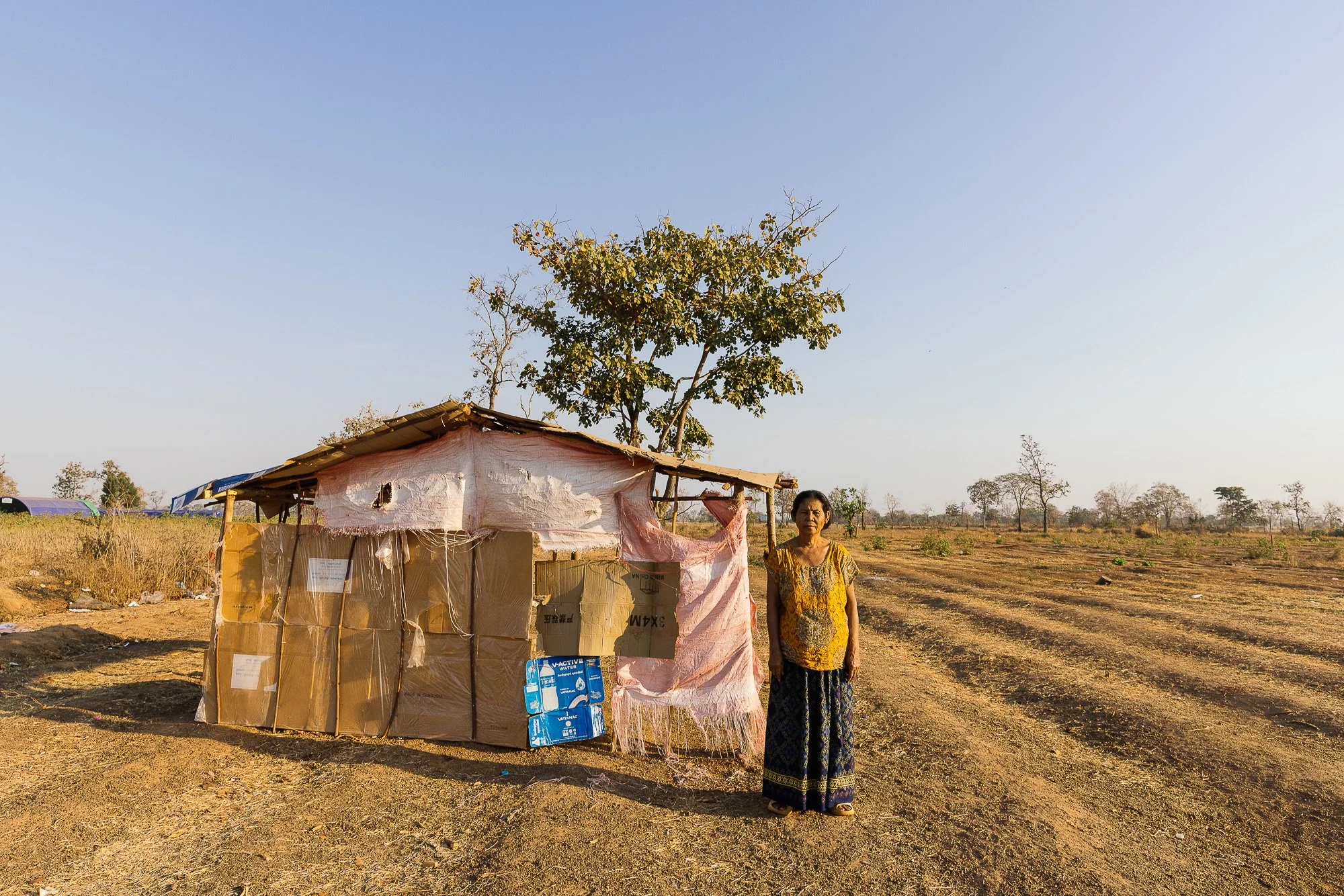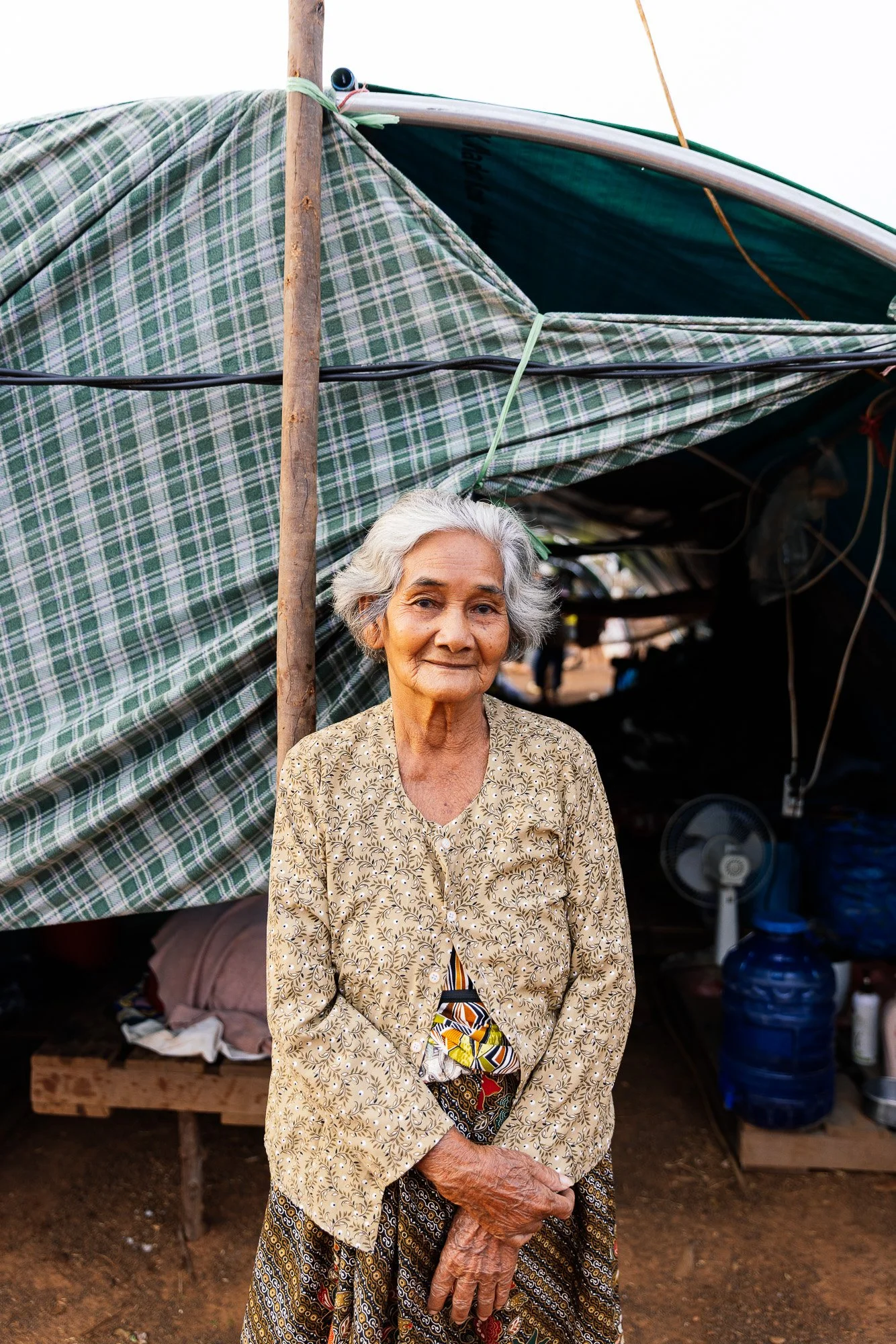 The work develops through ongoing photographic research in displacement camps along the Thai–Cambodian border, where families have taken refuge after fleeing violence and instability in nearby regions. Within these settlements, shelters constructed from tarpaulins, salvaged wood, and reused textiles become spaces where everyday life continues. Cooking, resting, washing, and caring for children unfold within structures never intended to be permanent.