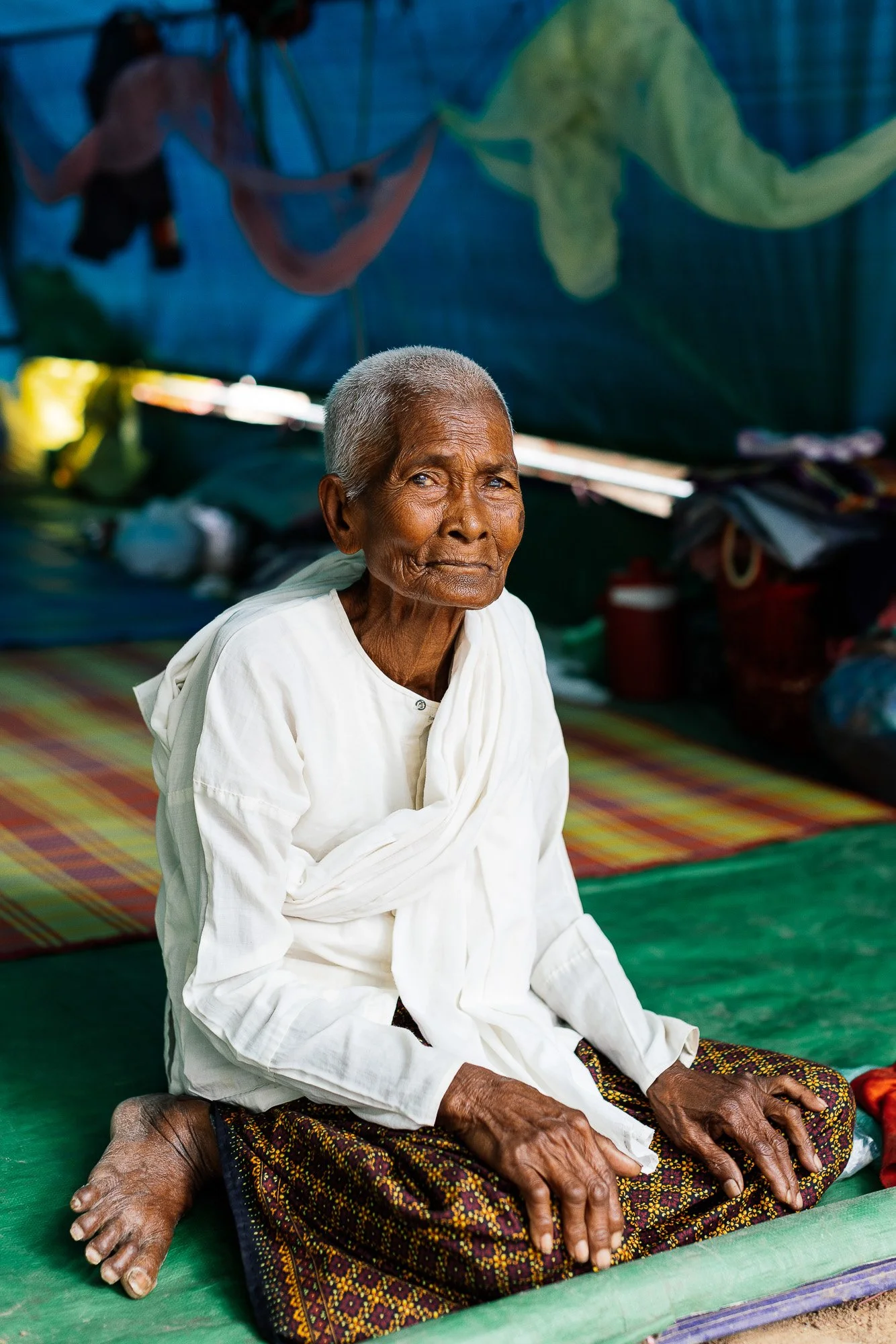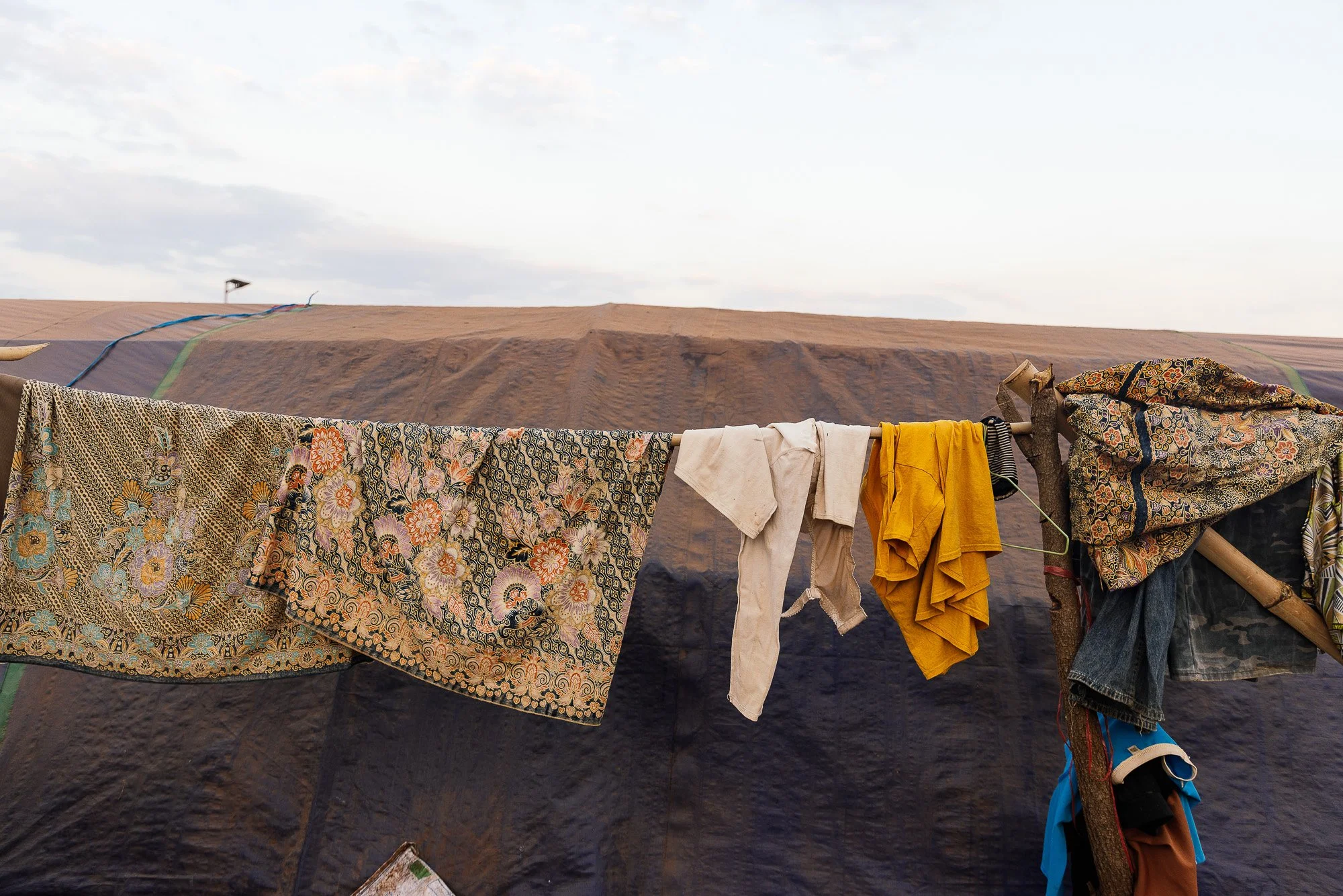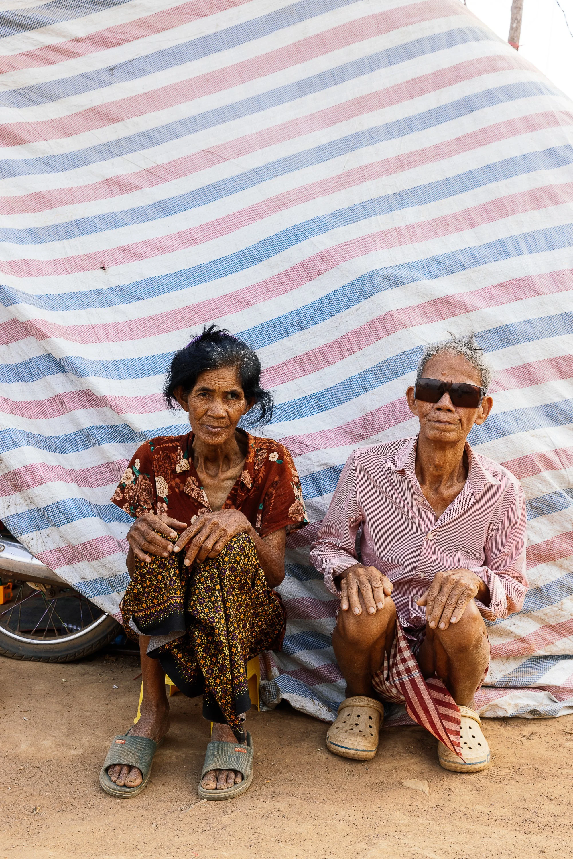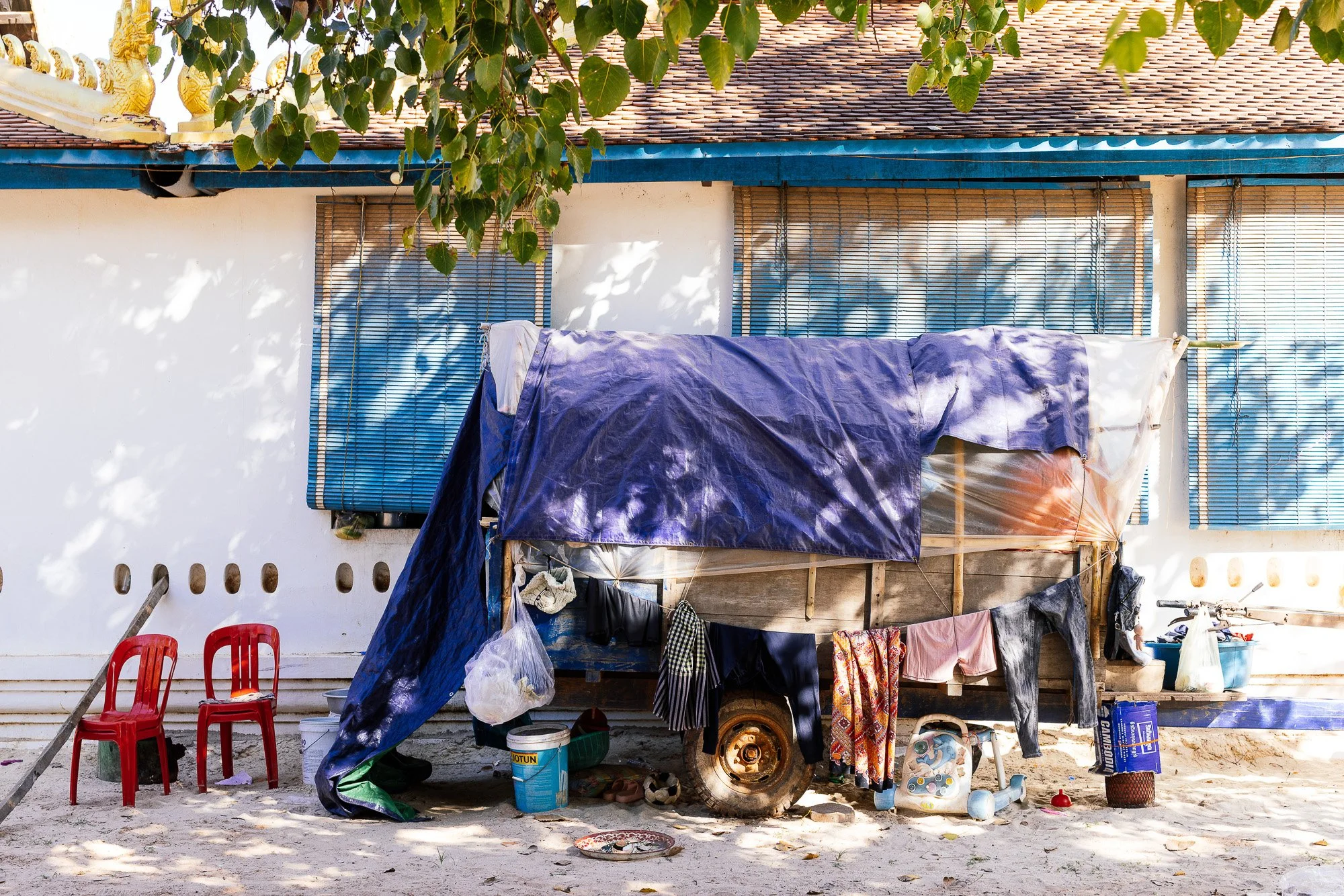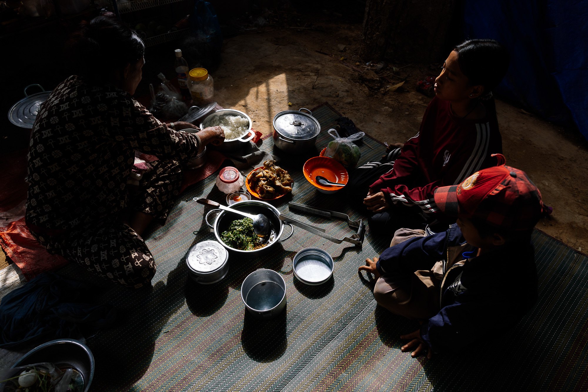 The work develops through ongoing photographic research in displacement camps along the Thai–Cambodian border, where families have taken refuge after fleeing violence and instability in nearby regions. Within these settlements, shelters constructed from tarpaulins, salvaged wood, and reused textiles become spaces where everyday life continues. Cooking, resting, washing, and caring for children unfold within structures never intended to be permanent.